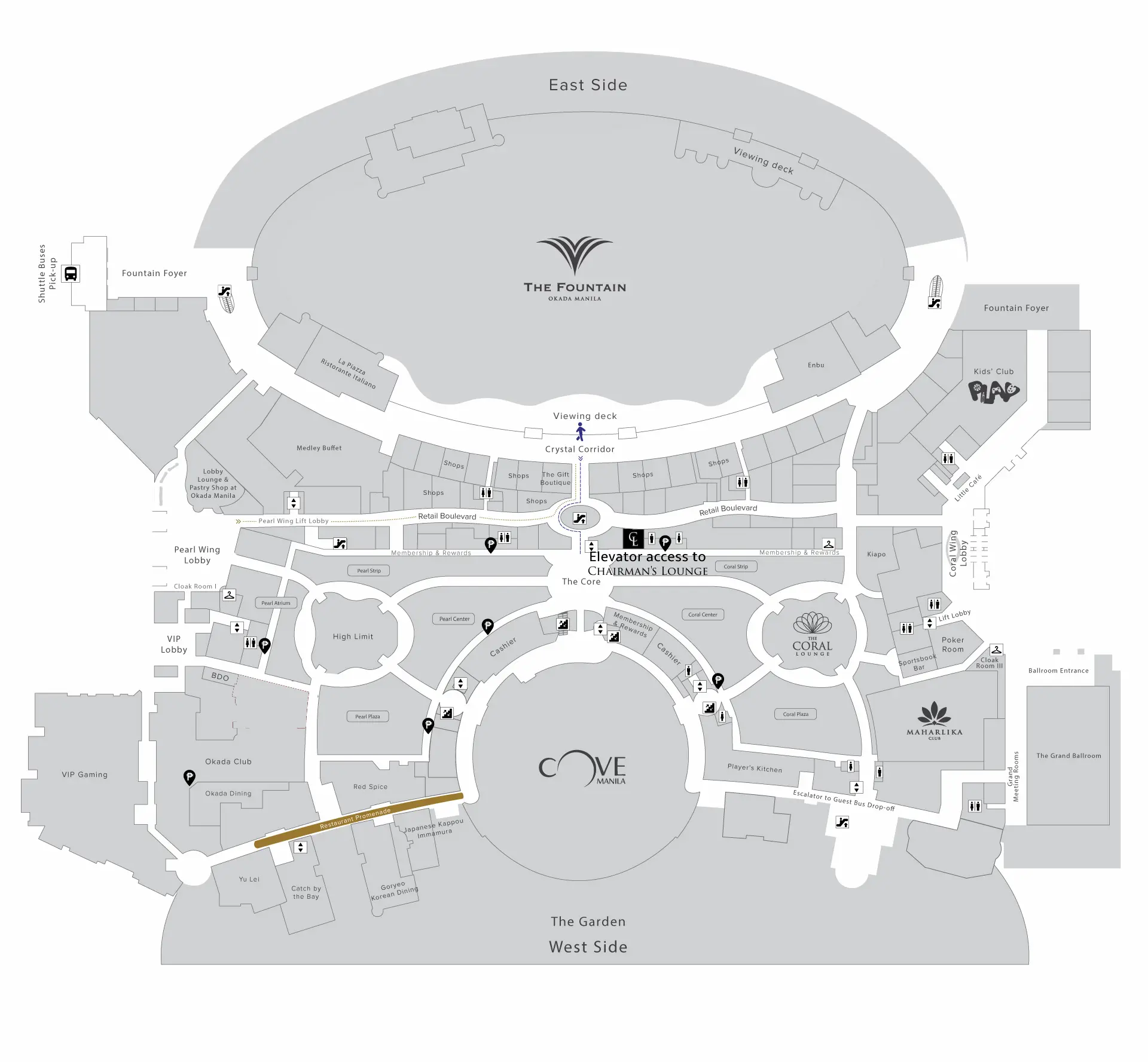 A lavishly appointed space reserved for the enjoyment of those with discerning taste, the Chairman’s Lounge offers a magnificent view of The Fountain and Manila Bay, as well as a selection of bar snacks and a meticulously curated drinks list–all amid an ambiance of rarefied luxury.