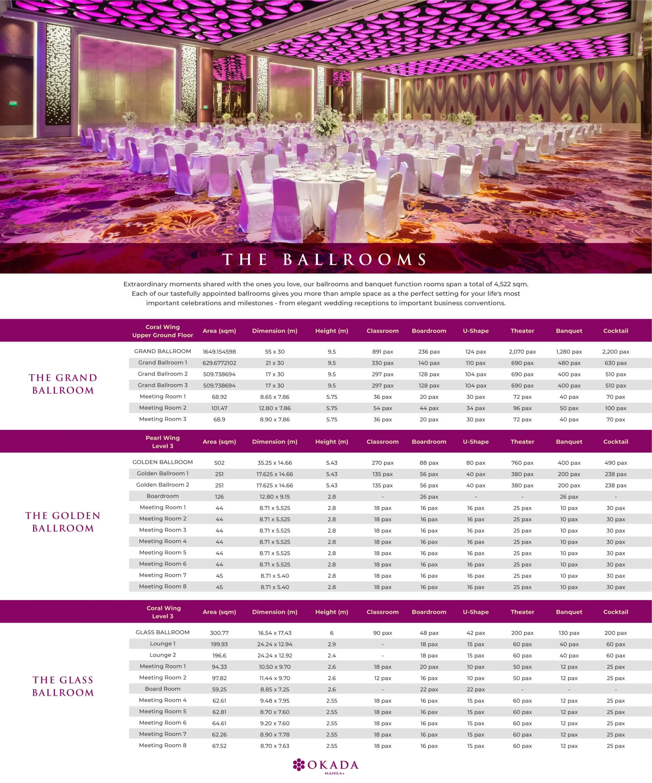 クリスタルのシャンデリア、カーペット敷きの床、金と大理石で装飾されたインテリアがきらめくコーラル・ウィングには、300平方メートルの荘厳なガラスのボールルームがあり、夢のような輝きを放っている。