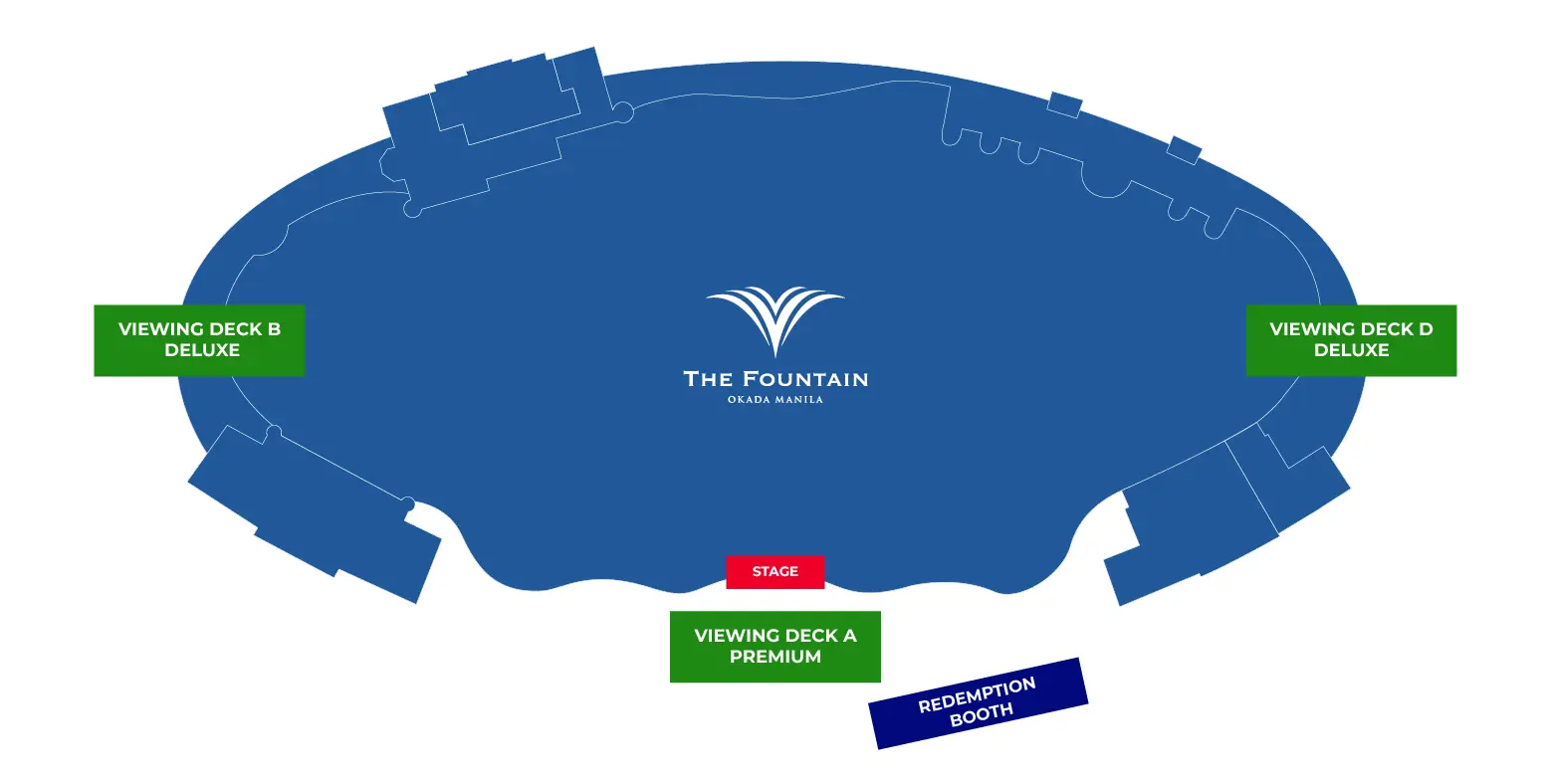 エレガントなクリスタル回廊とクリスタル・パビリオンに囲まれ、The Fountain 、光、水、音の幻想的な振り付けで選りすぐりの音楽に命を吹き込むことができる。The Fountain 、高度な水中ロボット、2000個以上の照明、数十台のハイファイ・スピーカー、オカダ・マニラ ホテルの建物の高さを超えて水を噴射できる700個以上のハイパワー・ジェットを備えている。