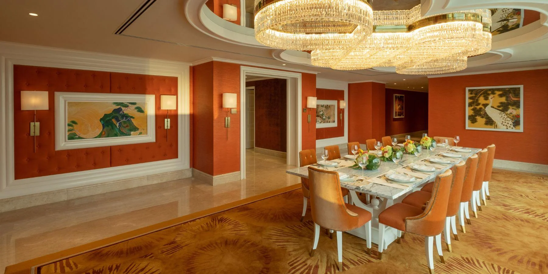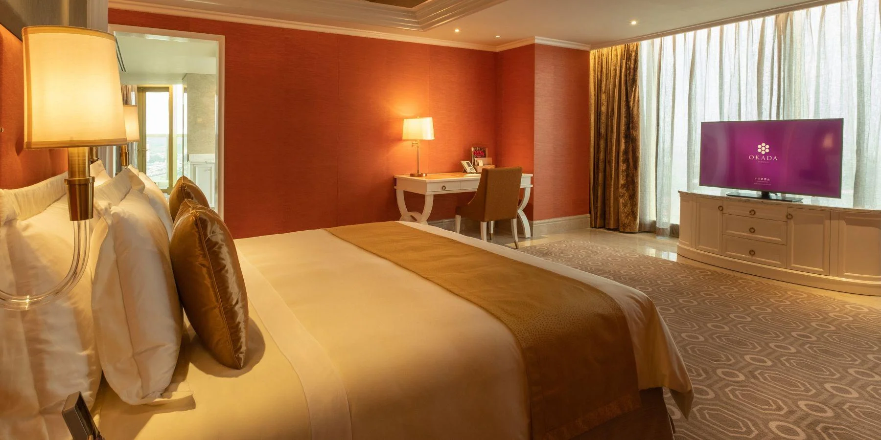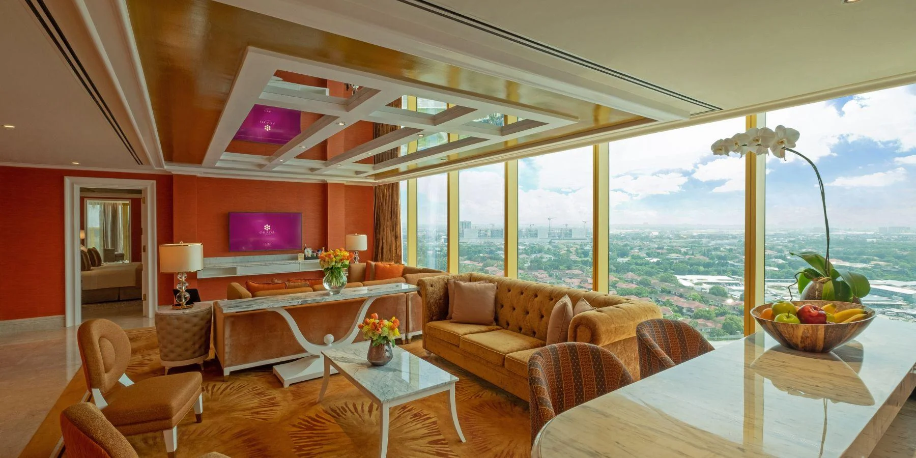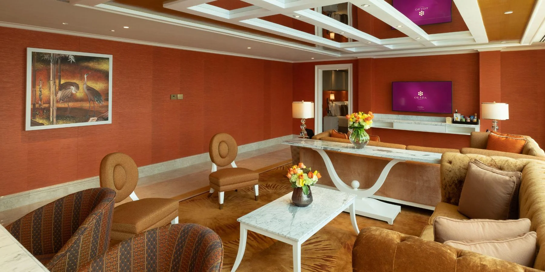 プレジデンシャル・スイートでは、あらゆる要素がその特徴的なテーマに忠実で、ゲストはオカダ・マニラ 、本来の楽しみ方を体験することができる。広々としたリビング&ダイニングエリア、プライベートバー、プライベートマッサージルームを備えた420㎡の2ベッドルームスイートで、ご自宅のようにおくつろぎいただけます。専用のバトラールーム、ナニールーム、パントリー、専用エレベーターまで完備。ネスプレッソのマシンで、朝は完璧なコーヒーで始まります。羽毛ベッド、リヴォルタ・カルミニャーニのイタリア製リネン、インテリジェント・トイレとジェットバスを備えた広々としたバスルーム、ロベルト・カヴァリのアメニティなど、細部にまでこだわった新しいレベルの快適さをお届けします。