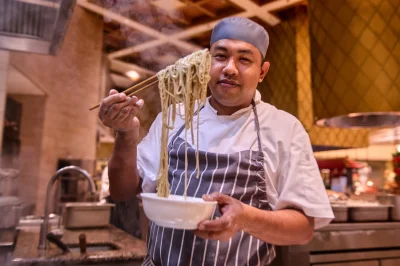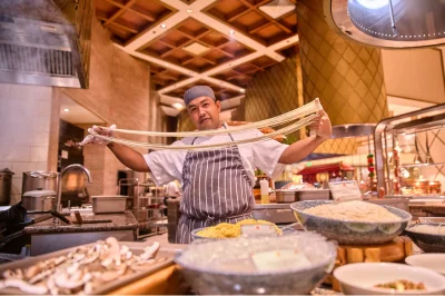 面食站为客人提供各种汤面,面条和汤料选择丰富,包括中式、泰式和新加坡式面条。