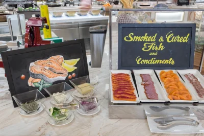 宾客们可以从沙拉站开始他们的美食之旅,那里有琳琅满目的混合沙拉、面包和特别日子和庆祝活动的小点心。熏鱼也是沙拉站的亮点之一,包括金枪鱼、鲷鱼和当地的鳕鱼,但最受欢迎的还是Medley Buffet的厨师们每天精心烹制的鲑鱼肉冻。
