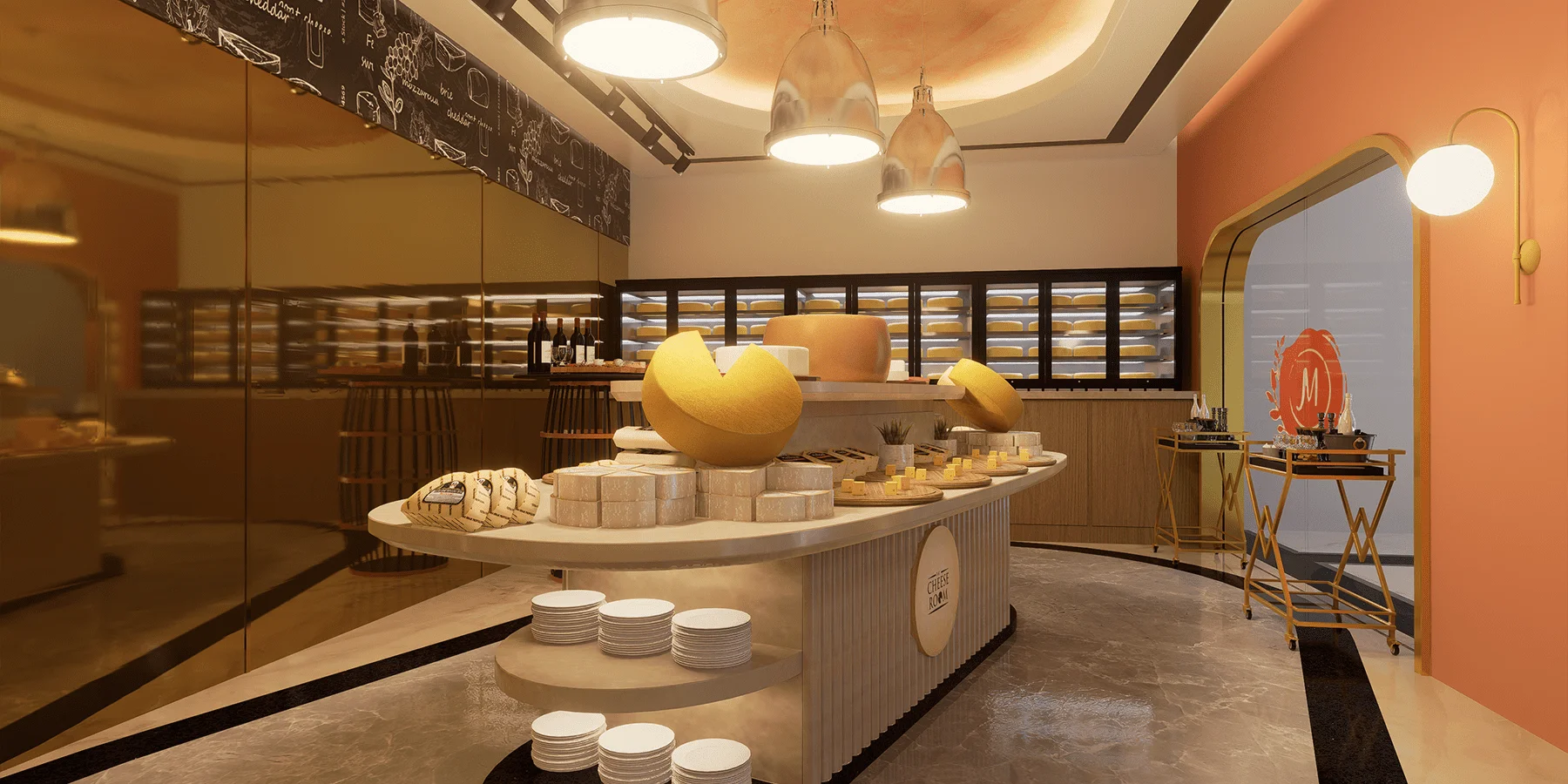 别具一格的奶酪室是一个温控空间,其优雅的构造可保持其丰富产品的卓越品质。